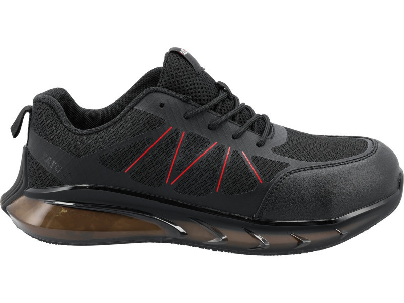 Innovative three-material sole. The outer, semi-transparent part made of TPU not only has aesthetic value but also functions as an air cushion around almost the entire perimeter. It guarantees increased comfort while working in non-standard positions. The inner part made of responsive EVA foam fully supports the foot and effectively absorbs vibrations. The slip-resistant tread made of rubber improves stability on surfaces covered with detergents as well as oily substances, confirmed by the receipt of the SR certification. Enhanced user comfort is complemented by an innovative popcorn design insole.