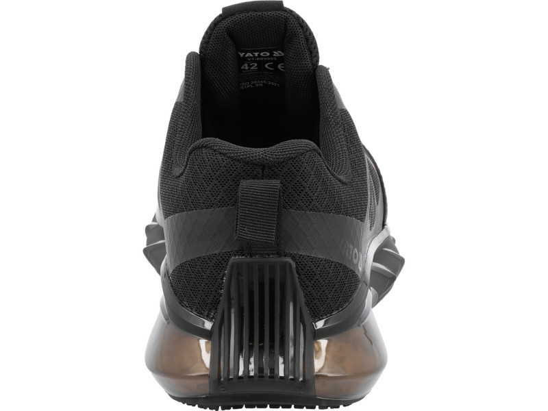 Innovative three-material sole. The outer, semi-transparent part made of TPU not only has aesthetic value but also functions as an air cushion around almost the entire perimeter. It guarantees increased comfort while working in non-standard positions. The inner part made of responsive EVA foam fully supports the foot and effectively absorbs vibrations. The slip-resistant tread made of rubber improves stability on surfaces covered with detergents as well as oily substances, confirmed by the receipt of the SR certification. Enhanced user comfort is complemented by an innovative popcorn design insole.
