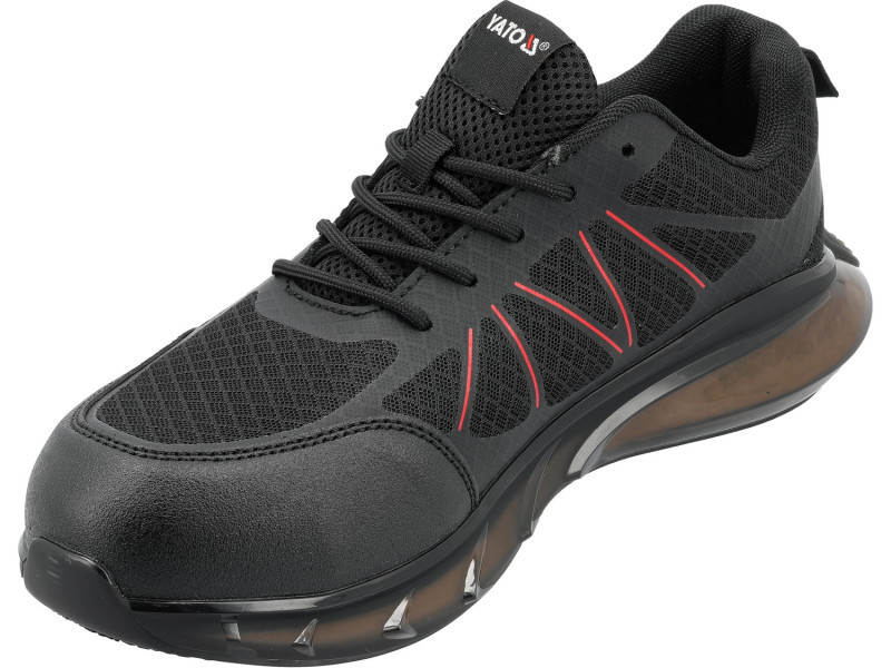 Innovative three-material sole. The outer, semi-transparent part made of TPU not only has aesthetic value but also functions as an air cushion around almost the entire perimeter. It guarantees increased comfort while working in non-standard positions. The inner part made of responsive EVA foam fully supports the foot and effectively absorbs vibrations. The slip-resistant tread made of rubber improves stability on surfaces covered with detergents as well as oily substances, confirmed by the receipt of the SR certification. Enhanced user comfort is complemented by an innovative popcorn design insole.