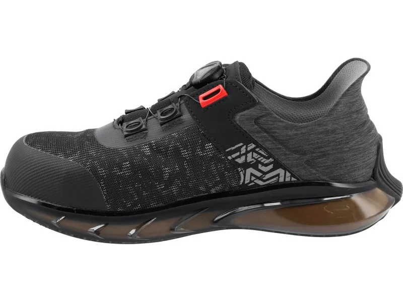 Innovative three-material outsole. The outer, semi-transparent part made of TPU not only has aesthetic qualities but also serves as an air cushion around almost the entire perimeter. It guarantees increased comfort while working in non-standard positions. The inner part made of responsive ETPU supports the foot entirely and excellently absorbs vibrations. The slip-resistant tread made of rubber improves stability on surfaces covered with detergents as well as oily substances, which is confirmed by receiving the SR certification. Enhanced user comfort is complemented by an innovative popcorn design insole.