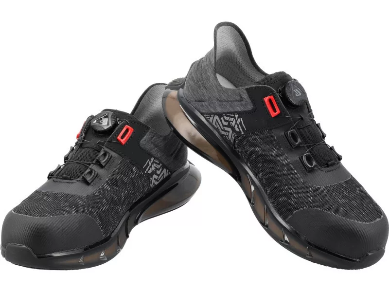 Innovative three-material outsole. The outer, semi-transparent part made of TPU not only has aesthetic qualities but also serves as an air cushion around almost the entire perimeter. It guarantees increased comfort while working in non-standard positions. The inner part made of responsive ETPU supports the foot entirely and excellently absorbs vibrations. The slip-resistant tread made of rubber improves stability on surfaces covered with detergents as well as oily substances, which is confirmed by receiving the SR certification. Enhanced user comfort is complemented by an innovative popcorn design insole.
