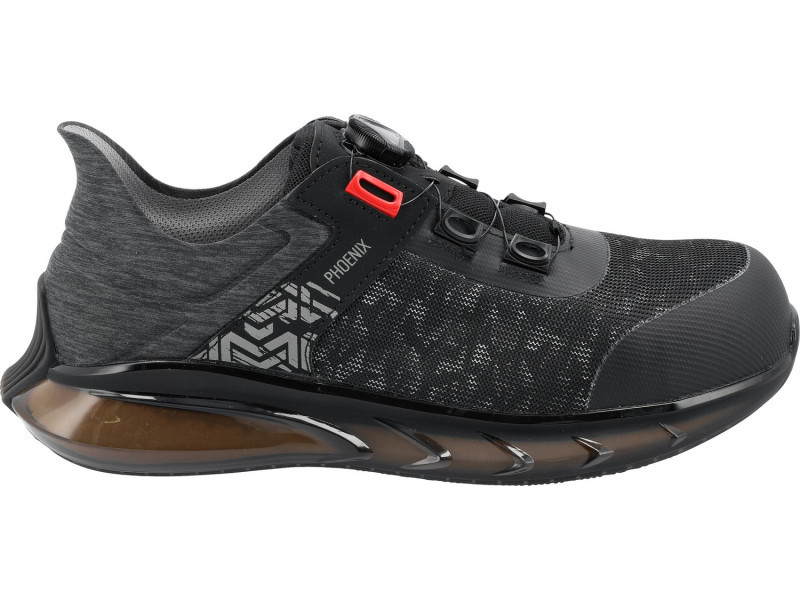 Lightweight work shoes from the PHOENIX S1PL series feature a durable fiberglass toe cap and a flexible aramid anti-puncture insole with an additional anti-static thread. The fiberglass toe cap is one of the lightest on the market and takes up less space for the toes compared to its composite counterpart. It does not absorb ambient temperature, which is appreciated both in winter during frosts and on hot days. The anti-puncture insole, unlike its steel equivalent, is flexible and does not restrict midfoot bending.