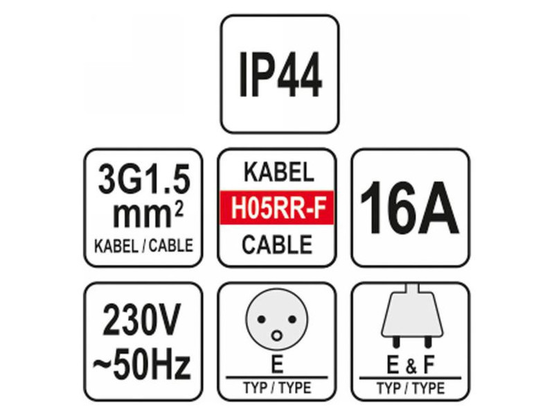 The cables are covered with insulation made of natural rubber H05RR-F, which characterized by high resistance to mechanical damage, atmospheric factors, chemical substances (cutting oils, gasoline, or ethyl, methyl alcohols). Such insulation provides a voltage rating of 300V / 500V. In addition, the extender is made according to IP 44 standard.