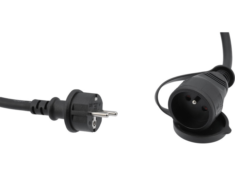 Building extension cable with dust and splash-proof socket. The chlorinated polyethylene (CPE) sheathed cable will work well both indoors and outdoors. It is resistant to oils, acids, most solvents and sunlight. It does not stiffen in the cold. Does not spread fire. It is characterised by high resistance to ageing.