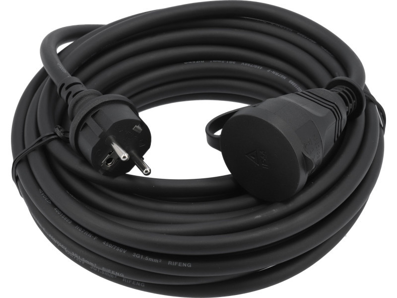 Construction and workshop extension cable with dust and splash-proof socket. The increased diameter chlorinated polyethylene (CPE) sheathed cable will work well both indoors and outdoors. It is resistant to oils, acids, most solvents and sunlight. It does not stiffen in the cold. Does not spread fire. It is characterised by high resistance to ageing. The increased diameter of the insulation improves puncture resistance parameters and increases resistance to mechanical damage.