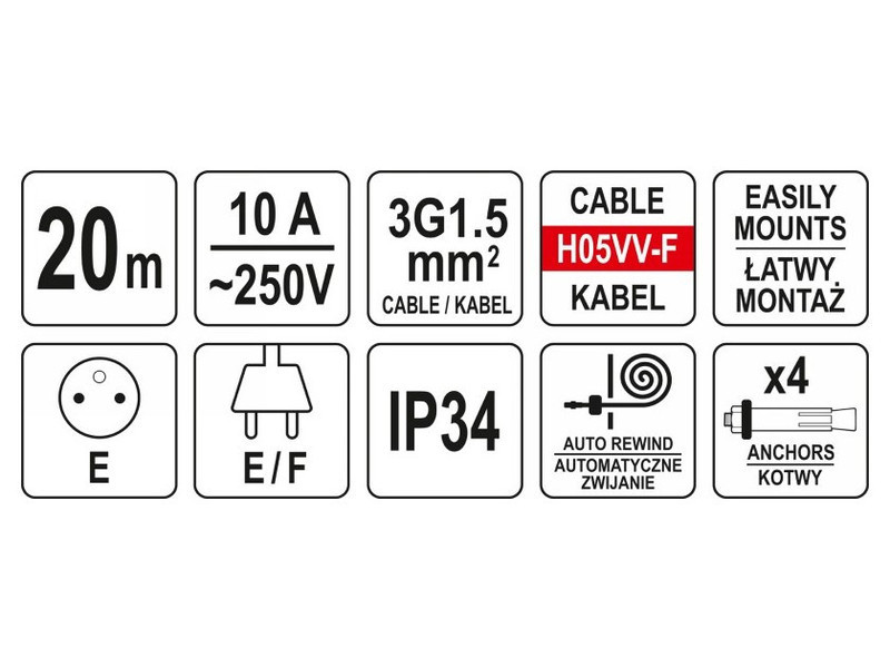 | Max. load (cable fully unrolled) | 3000 W |