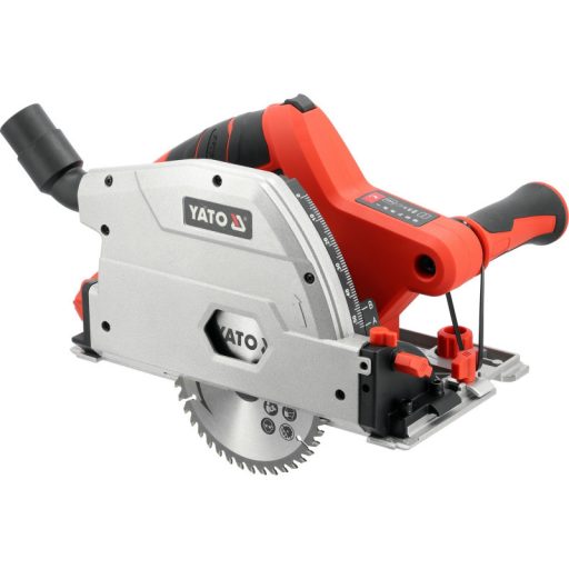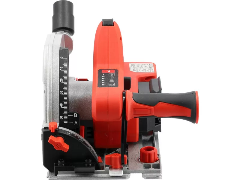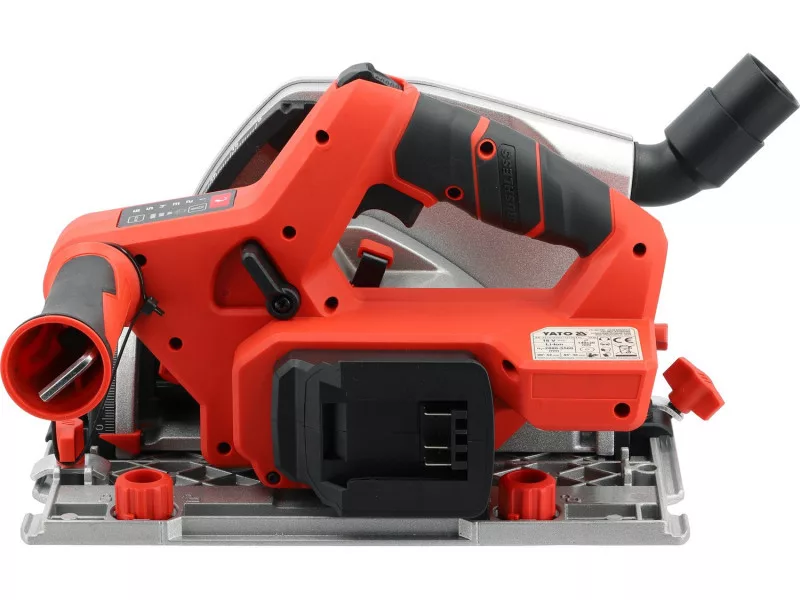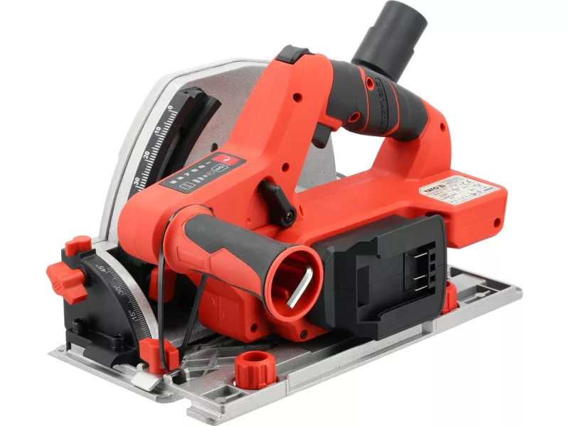 Brushless cordless plunge saw designed for precise cutting of wood and wood-based materials such as plywood, particle boards, MDF, or laminates using circular saw blades. The tool's design allows for straight cuts from the edge of the material as well as plunge cutting mode, enabling work to begin at any point on the workpiece. With the use of a parallel guide and a rail guide, it is possible to guide the tool along a stable line, facilitating accurate and repeatable results (rail and clamps included).