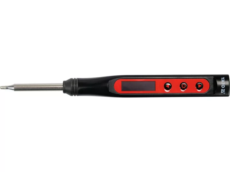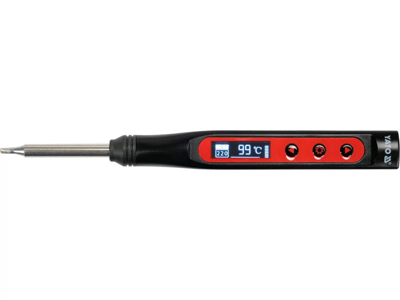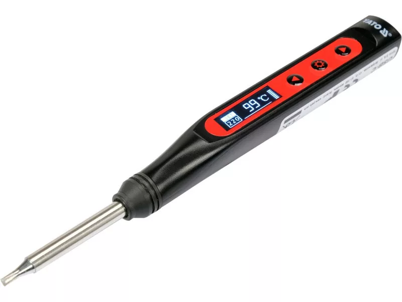 Portable digital soldering iron for T-12 tips powered by a USB-C port. The T12 soldering tips are a combination of ceramic-sunk resistance wire, temperature sensor and high-quality soldering tip. The integrated arrowhead design allows for express heating and a very fast temperature stabilising effect. The soldering iron works with any power source with a voltage from 9 to 24 V and a current capacity of more than 1.5 A. These can be either fast phone chargers, laptop power supplies, powerbanks with QC or PD technology ports, Li-Ion cell assembly, some YATO travel adapters, etc.