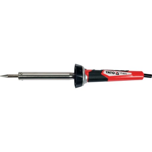 A flask soldering iron YT-8273 in a traditional housing with a resistance heater powered directly from a wall outlet. The simplicity of the design makes the device almost failure-free, and with proper care of the soldering iron tip will serve for many years. The power of the heater is sufficient to properly solder two copper wires, basic electronics in through-hole assembly technology or for work involving the connection of stained glass elements, jewelry using the Tiffany method. The high-quality coated copper tip ensures faster heat accumulation and dissipation than standard tips, and the touch-friendly two-component handle with an anti-slip element further improves safety in use.