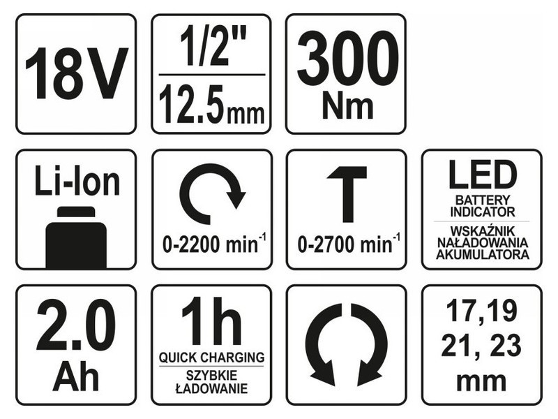 | Set includes | impact wrench, impact socket x4 (17 mm, 19 mm, 21 mm, 23 mm) |
