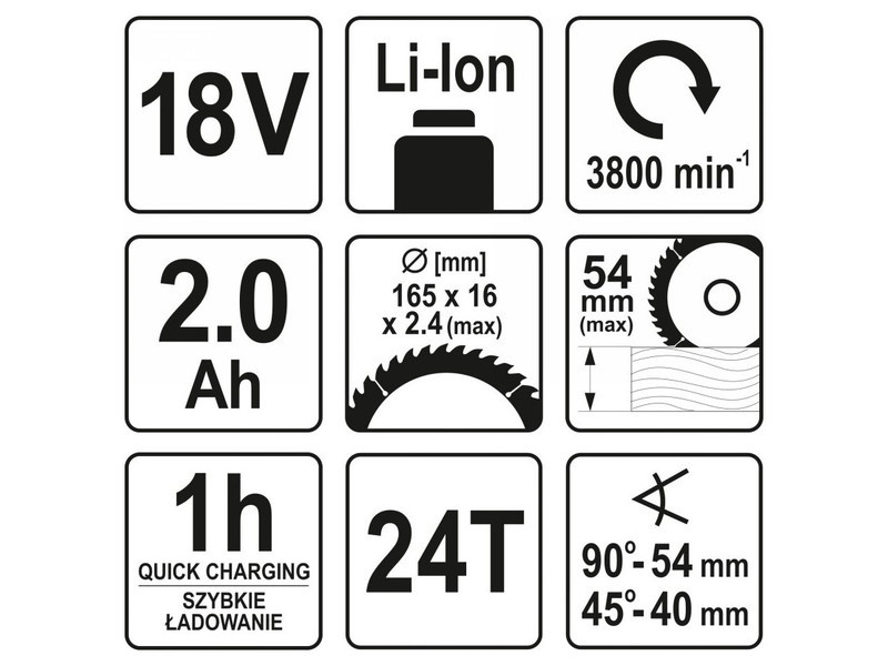 Included in the set: saw, 18 V 2 Ah Li-Ion battery, fast charger (1 h for 2 Ah battery).