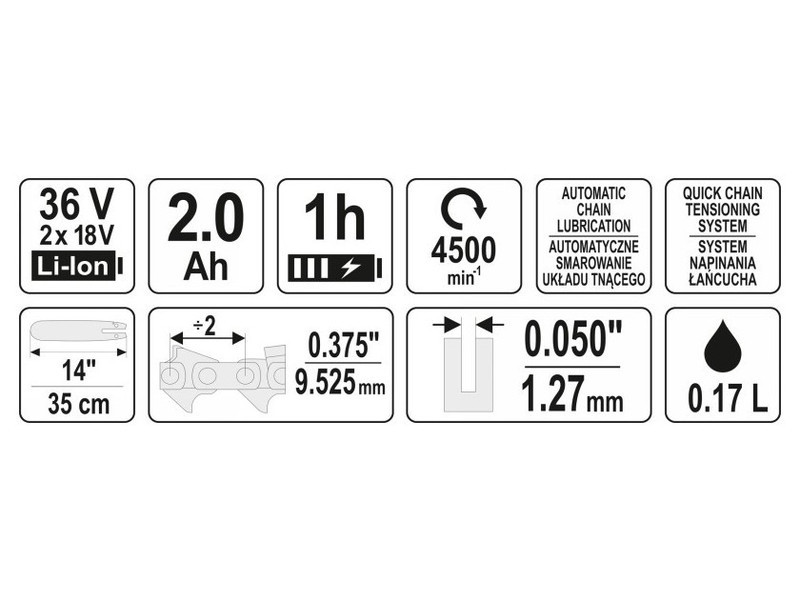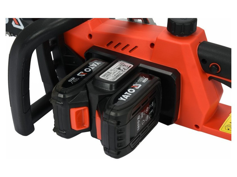 Double power chainsaw with a system battery power of 36 V. Designed for work in household and garden: lightweight, compact, and easy to use. Allows for easy gardening and renovation-construction work.