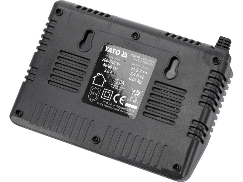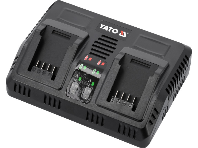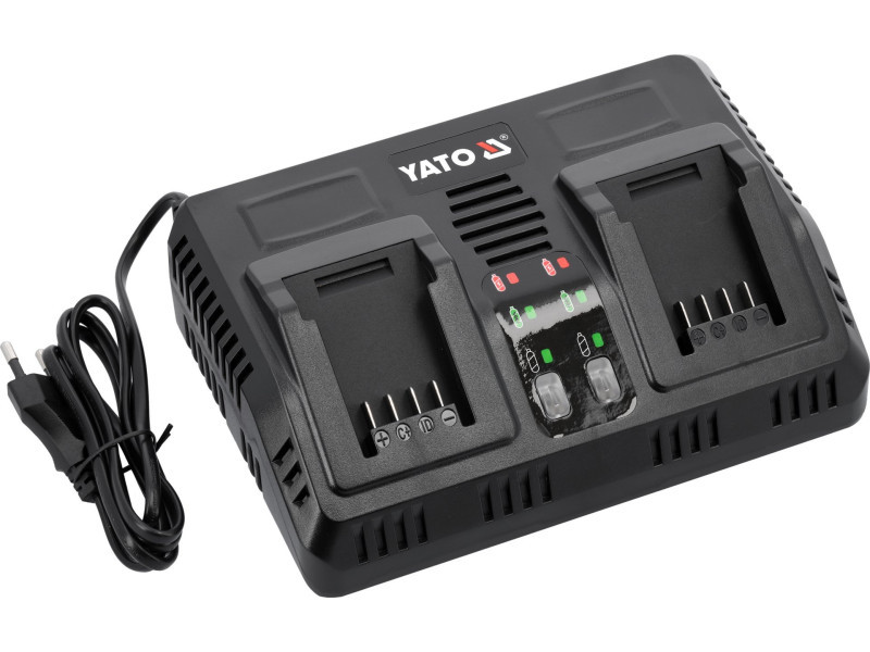 Dual charger for all YATO 18-volt system aculmulators. It charges both two batteries simultaneously and individually. A built-in battery performance and temperature testing system takes care of battery life. Does not start charging when cells are too hot. In the case of a battery stored in a negative temperature, it starts charging when the battery reaches a temperature above +5 degrees Celsius.