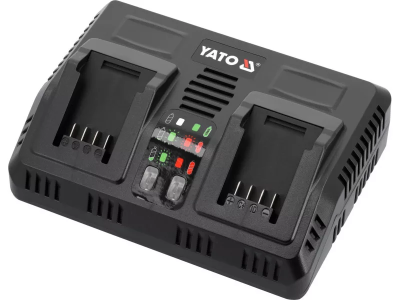 Fast dual charger for all YATO 18-volt system aculmulators. A built-in battery performance and temperature testing system takes care of battery life. Does not start charging when cells are too hot. In the case of a battery stored in a negative temperature, it starts charging when the battery reaches a temperature above +5 degrees Celsius.