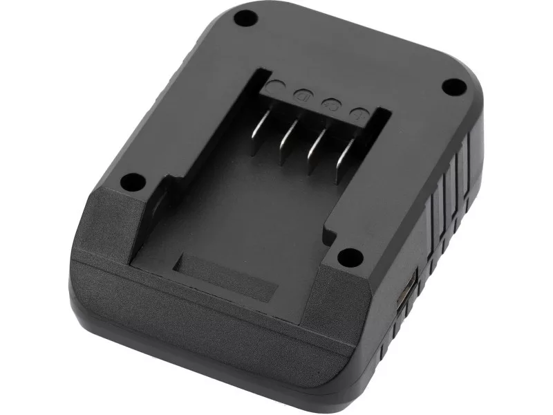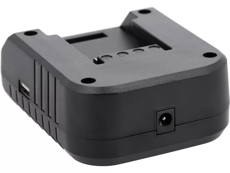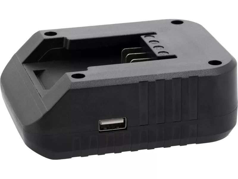 YATO 18-volt system battery charger plugged into a car lighter socket. The device also allows mobile devices to be charged via a USB cable using the YATO system's 18-volt battery or cigarette lighter socket.