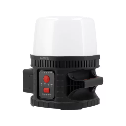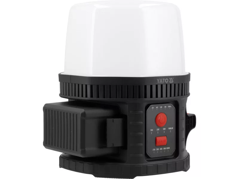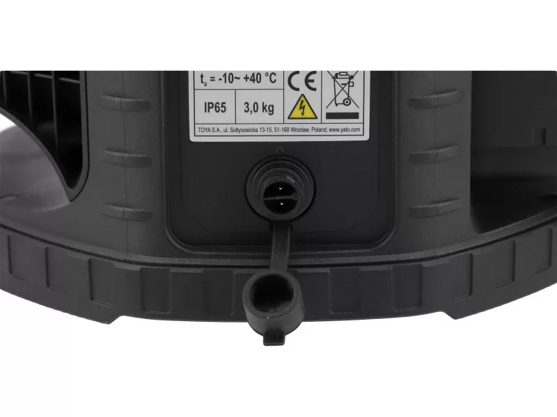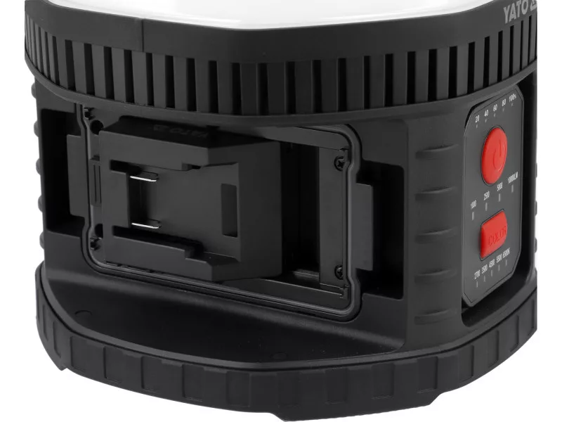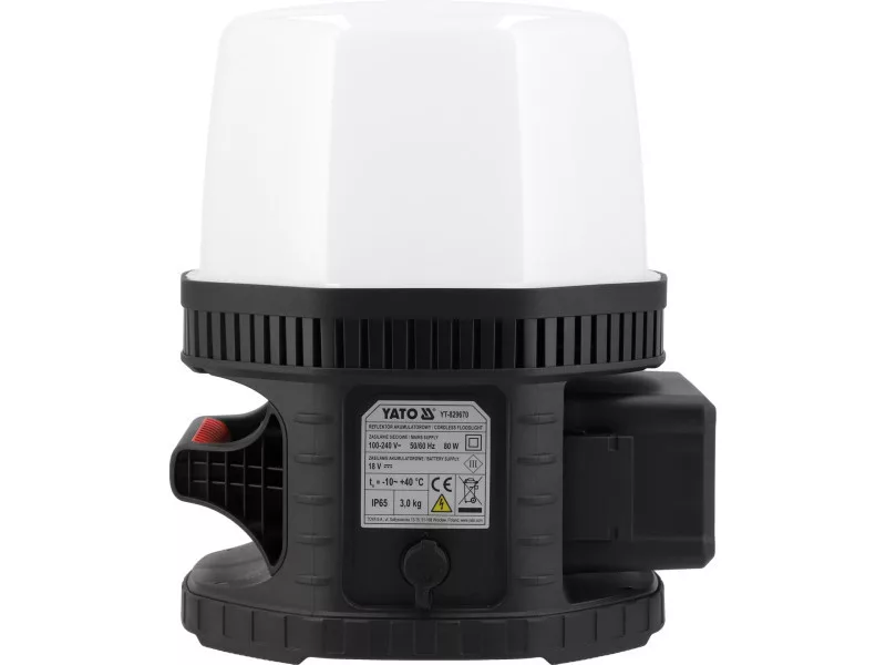 The spotlight operates powered by mains or YATO 18 V platform batteries. Unlike many other models that lose power in mains mode, the YT-829670 lamp provides the same light intensity (lumens) regardless of the power source. Additionally, thanks to adapters, it allows work on batteries of other types.