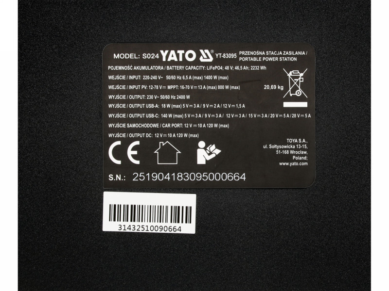 Portable YATO power station with a very large capacity 2232 Wh and power of 2400 W, equipped with a modern LiFePO4 battery, is a reliable and long-lasting source of energy designed for a wide range of applications. The lithium-iron-phosphate technology ensures high cell life, resistance to deep discharges, and stable operating parameters even under prolonged load. Such a large capacity allows for safe power supply for devices with low power consumption, such as lighting or mobile electronics, as well as tools and selected household appliances, without the need for frequent recharging of the station.
