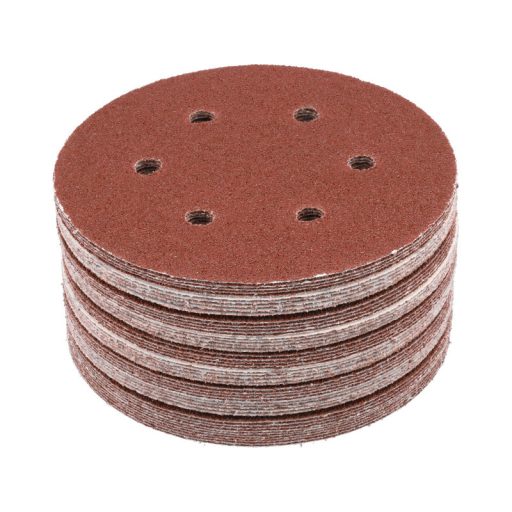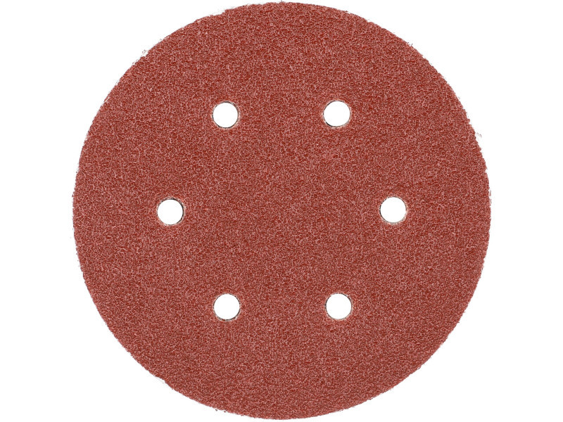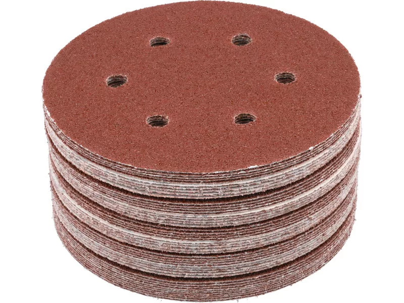 6 HOLE, 150MM DIAMeter, grit 40, MATERIAL: ALUMINIUM OXIDE, BACK: HOOK FASTENER,50PCS, BOND: EPOXY RESIN, EMBOSSING: SEMI-OPEN. SIX-HOLE ABRASIVE DISCS ARE DESIGNED FOR SANDING PAINT, VARNISH, WOOD AND METAL SURFACES. CO-OPERATE WITH OSCILLATION AND MIMMILLAR SANDERS YT-09739, YT-09740.