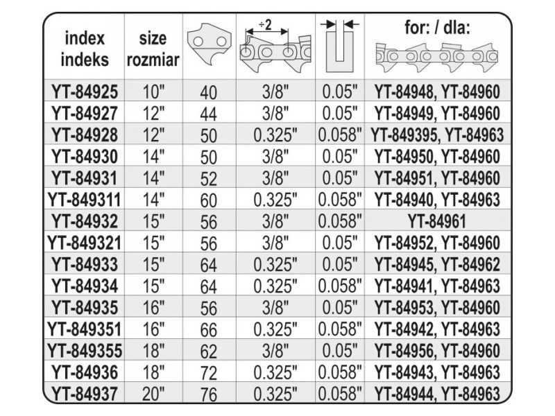 The YATO guides are designed for home and professional use. They are dedicated to work aroundó3 the house, in the garden. They are also successfully suitable for tree felling work. It is suggested to use the guides with chains YATO YT-84948 or YT-84960. It is also possible to use them with chains from other manufacturersós.