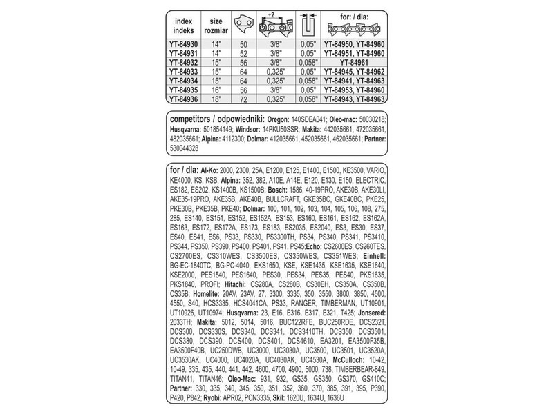 YATO guides are designed for home and professional use. They are dedicated to work around the house, in the garden. They are also successfully suitable for logging work. It is suggested to use the guides with chains YATO YT-84951 or YT-84960.It is also possible to use them with chains from other manufacturers.