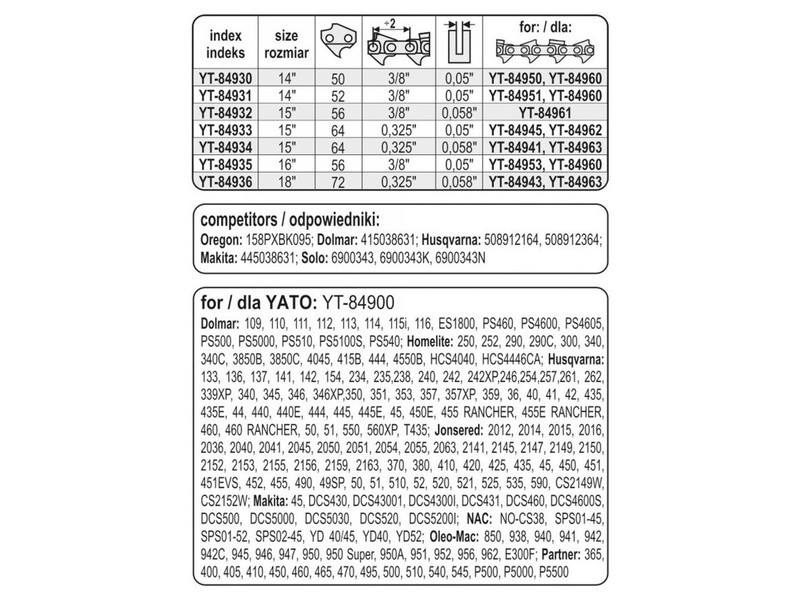 YATO YT-84934 guide bar is designed for use with, among others, YATO YT-84900 chainsaw.It is suggested to use the guides with YATO YT-84941 or YT-84963 chains.It is also possible to use them with chains from other manufacturers.