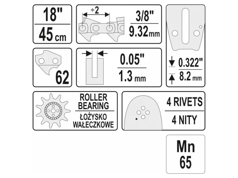 Length 18", 62 links, pitch 3/8", width 0.05" (1.3 mm).