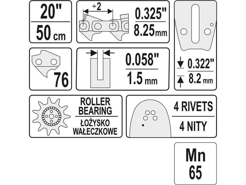 Length 20", 76 links, pitch 0.325", width 0.058" (1.5 mm).