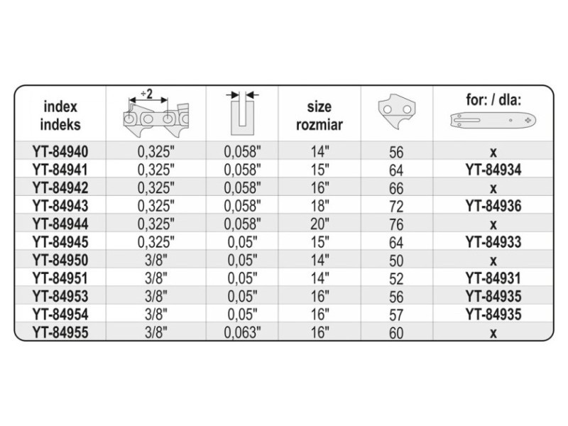 It is designed for petrol and electric chainsaws - especially recommended for use with the YT-84900 chainsaw. Recommended for cutting clean and medium-dirty wood for home and professional use. YATO YT-84940 chain can be used for chainsaws: - Alpina: A40, A40E, P400, P450, P460, P500, P510, P522, PRO540, PRO600, PROF-41, PROF-45 Dolmar: 109, 110, 111, 112, 113, 114, 115i, 116, ES1800, PS460, PS4600, PS4605, PS500, PS5000, PS510, PS5100S, PS540 - Echo: , CS4200ES, CS4400 - Homelite: 250, 252, 290, 290C, 300, 340, 340C, 3850B, 3850C, 415B, 444, 4550B, HCS4040, HCS4045, HCS4446CA - Husqvarna: 133, 136, 137, 140, 141, 142, 154, 234, 235, 238, 240, 240e, 242, 242XP, 246, 254, 254XP, 257, 261, 262, 338XPT, 339XP, 340, 345, 346, 346XP, 350, 351, 353, 357, 357XP, 359, 36, 365, 40, 41, 42, 435, 435E, 44, 440E, 444, 445, 445E, 45, 450E, 455 RANCHER, 455E ANCHER, 460, 460 RANCHER, 50, 51, 55, - Jonsered: 2012, 2014, 2015, 2016, 2036, 2040, 2041, 2045, 2050, 2051, 2054, 2055, 2063, 2141, 2145, 2147, 2149, 2150, 2152, 2153, 2155, 2156, 2159, 2163, 370, 380, 410, 420, 425, 435, 45, 450, 451, 451EVS, 452, 455, 490, 49SP, 50, 51, 510, 52, 520, 521, 525, 535, 590, CS2149W, CS2152W, - Makita: 45, DCS430, DCS43001, DCS4300I, DCS431, DCS460, DCS4600S, DCS4630, DCS500, DCS5000, DCS5030, DCS520, DCS5200I - NAC: NO-CS38, SPS01-45, SPS01-52, SPS02-45, YD 40/45, YD40, YD52 - Oleo-Mac: 850, 938, 940, 941, 942, 945, 946, 47, 950, 950 Super, 950A, 951, 952, 956, 962, E300F, GS350, GS370, GS410CX - Partner: 1200EL, 1400EL, 1450EL, 1500EL, 1650, 1650EL, 365, 400, 405, 410, 450, 460, 465, 470, 495, 500, 510, 540, 545, P500, P5000, P5500 - Stihl: 024, 026, 028, 029, 030, 031, 032, 034, 036, 039, MS200, MS240, MS260, MS270, MS280, MS290, MS360, MS361, MS36E, MS390