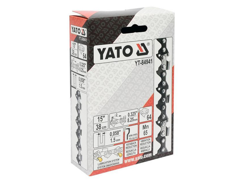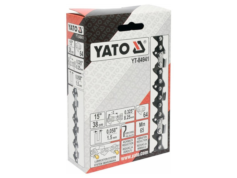 It is designed for petrol and electric chainsaws - especially recommended for use with YT-84934 guide bar for YT-84900 chainsaw Recommended for cutting clean and medium-dirty wood for both home and professional use YATO YT-84941 chain can be used for chainsaws: - Dolmar: 109, 110, 111, 112, 113, 114, 115i, 116, ES1800, PS460, PS4600, PS4605, PS500, PS5000, PS5510, PS5100S, PS540 - Husqvarna: 154, 257, 440e, 133, 136, 137, 140, 141, 142, 234, 235, 238, 240, 240e, 242, 242XP, 246, 254, 254XP, 261, 262, 338XPT, 339XP, 340, 345, 346, 346XP, 350, 351, 353, 357, 357XP, 359, 36, 365, 372XP, 40, 41, 42, 435, 435E, 44, 444, 445, 445E, 45, 450E, 455 , RANCHER, 455E RANCHER, 460 RANCHER, 50, 51, 55, T435 - Jonsered: 520, 2012, 2014, 2015, 2016, 2036, 2040, 2041, 2045, 2050, 2051, 2054, 2055, 063, 2141, 2145, 2147, 2149, 2150, 2152, 2153, 2155, 2156, 2159, 2163, 370, 380, 410, 420, 425, 435, 45, 450, 451, 451EVS, 452, , 455, 490, 49SP, 50, 51, 510, 52, 521, 525, 535, 590, CS2149W,, CS2152W - Makita: 45, DCS430, DCS43001, DCS4300I, , DCS431, DCS460, DCS4600S, DCS4630, DCS500, DCS5000, DCS5030, DCS520, DCS5200I - NAC: NO-CS38, SPS01-45, SPS01-52, SPS02-45, YD 40/45, YD40, YD52 - Oleo-Mac: 850, 938, 940, 941, 942, 945, 946, 947, 950, 950 Super, 950A, 951, 952, 956, , 962, E300F - Partner: 1650, 365, 400, 405, 410, 450, 460, 465, 470, 495, 500 ,510, 540, 545, P500, P5000, P5500