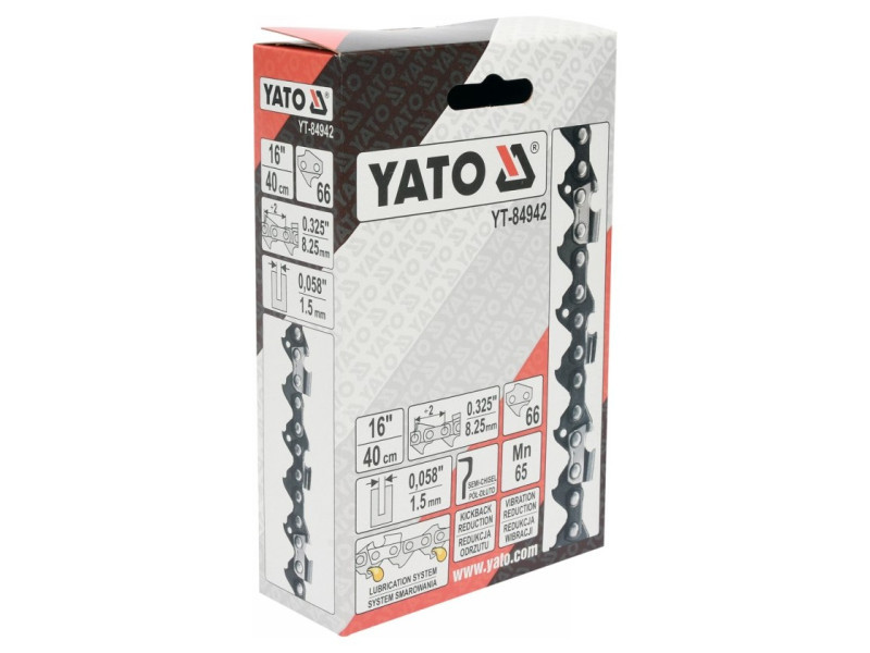 It is designed for petrol and electric chainsawsRecommended for cutting clean and moderately dirty wood for home and professional use YATO YT-84942 chain can be used for chainsaws: - Dolmar: 109, 110, 111, 112, 113, 114, 115i, 116, ES1800, PS460, PS4600, PS4605, PS500, PS5000, PS5510, PS5100S, PS540 - Husqvarna: 154, 257, 440e, 133, 136, 137, 140, 141, 142, 234, 235, 238, 240, 240e, 242, 242XP, 246, 254, 254XP, 261, 262, 338XPT, 339XP, 340, 345, 346, 346XP, 350, 351, 353, 357, 357XP, 359, 36, 365, 372XP, 40, 41, 42, 435, 435E, 44, 444, 445, 445E, 45, 450E, 455, RANCHER, 455E RANCHER, 460 RANCHER, 50, 51, 55, T435 - Jonsered: 520, 2012, 2014, 2015, 2016, 2036, 2040, 2041, 2045, 2050, 2051, 2054, 2055, 063, 2141, 2145, 2147, 2149, 2150, 2152, 2153, 2155, 2156, 2159, 2163, 370, 380, 410, 420, 425, 435, 45, 450, 451, 451EVS, 452, , 455, 490, 49SP, 50, 51, 510, 52, 521, 525, 535, 590, CS2149W, CS2152W - Makita: 45, DCS430, DCS43001, DCS4300I, DCS431, DCS460, DCS4600S, DCS4630, DCS500, DCS5000, DCS5030, DCS520, DCS5200I - NAC: NO-CS38, SPS01-45, SPS01-52, SPS02-45, YD 40/45, YD40, YD52 - Oleo-Mac: 850, 938, 940, 941, 942, 945, 946, 947, 950, 950 Super, 950A, 951, 952, 956, 962, E300F - Partner: 1650, 365, 400, 405, 410, 450, 460, 465, 470, 495, 500 ,510, 540, 545, P500, P5000, P5500