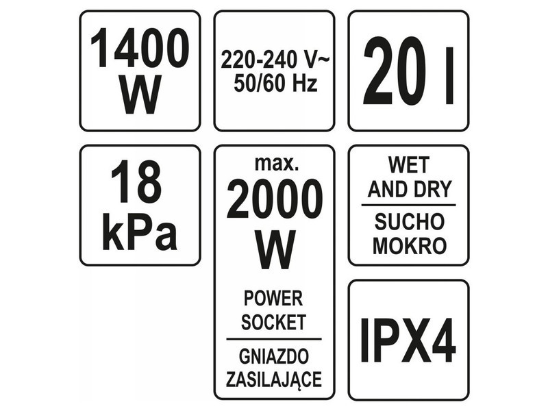 YATO workshop vacuum cleaner with 1400W power and 18 kPa suction power. It has a tank with a capacity of 20 L. The vacuum cleaner is equipped with a telescopic, anti-static tube. It also has a built-in socket, allowing it to power power tools. It allows wet and dry work. It can also be used as a blower.