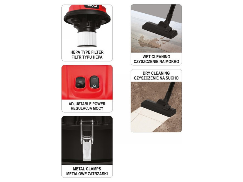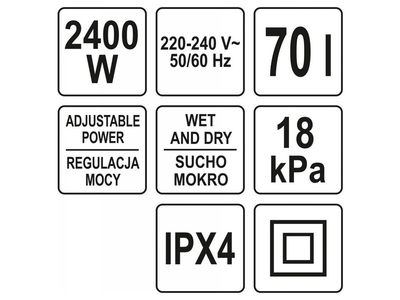 Industrial vacuum cleaner by YATO with 2400 W power and 18 kPa suction power. Equipped with a tank 70 L. The high power allows for fast and easy work on large, heavily soiled surfaces. Designed for use in hotels, offices, stores, public buildings.