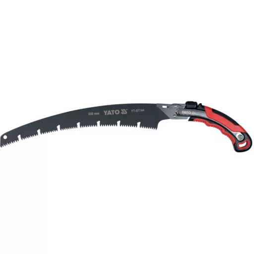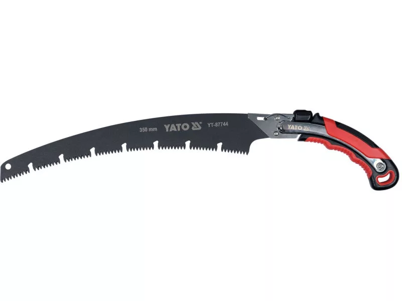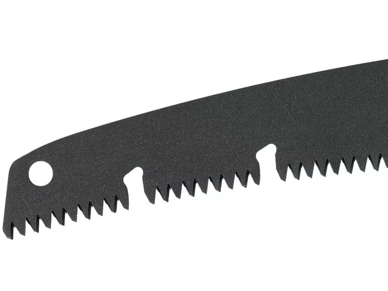 Saw with curved blade made of SK5 high-carbon steel. Inductively hardened saw teeth, sharpened on three sides. This allows the saw to cut in both directions. PTFE-coated blade. Handle covered with rubberized TPR material for a secure grip. Removable blade. Saw complete with holster.