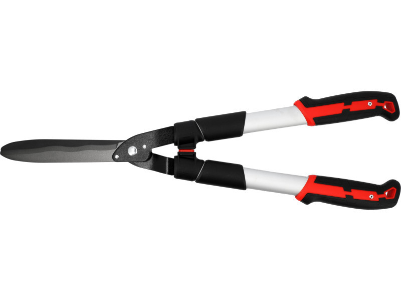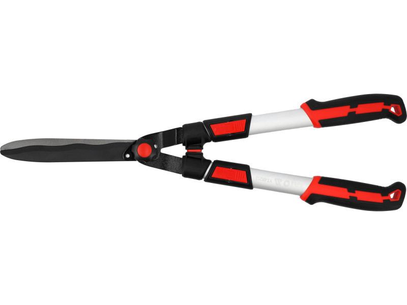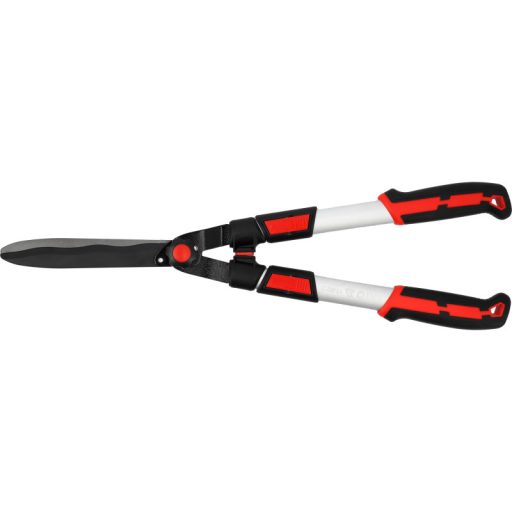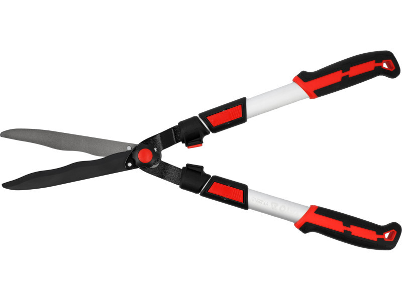 Telescopic hedge shears with adjustable length from 660 to 825 mm allow for comfortable trimming of hedges at different heights. The wavy blades, 220 mm long, made of resistant 65 Mn carbon steel, covered with PTFE at the top, ensure precise and clean cutting of branches up to 6 mm in diameter, facilitating the daily maintenance of garden shrubs and shaping the hedge.