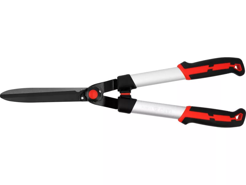 Aluminum hedge shears with a straight blade length of 220 mm, made of durable and resistant 65 Mn carbon steel. They allow for precise and clean cutting of branches up to 6 mm in diameter, facilitating the daily maintenance of garden shrubs and shaping hedges. The PTFE coating covering the upper blade limits the sticking of juices, extending the tool's lifespan.