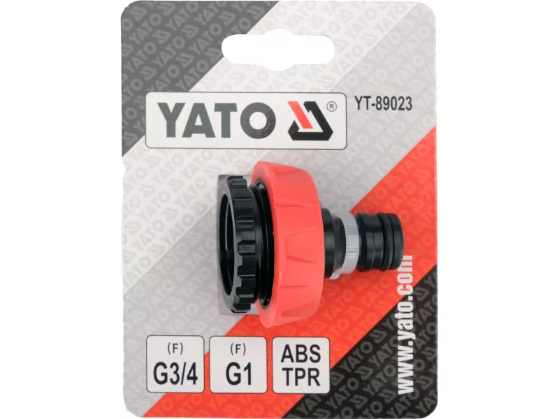Yato YT-89023 is a universal faucet connector designed for faucets with diameters of 3/4" and 1". Thanks to its solid construction made of ABS and TPR materials, it ensures durability, tightness, and easy installation without the use of tools.