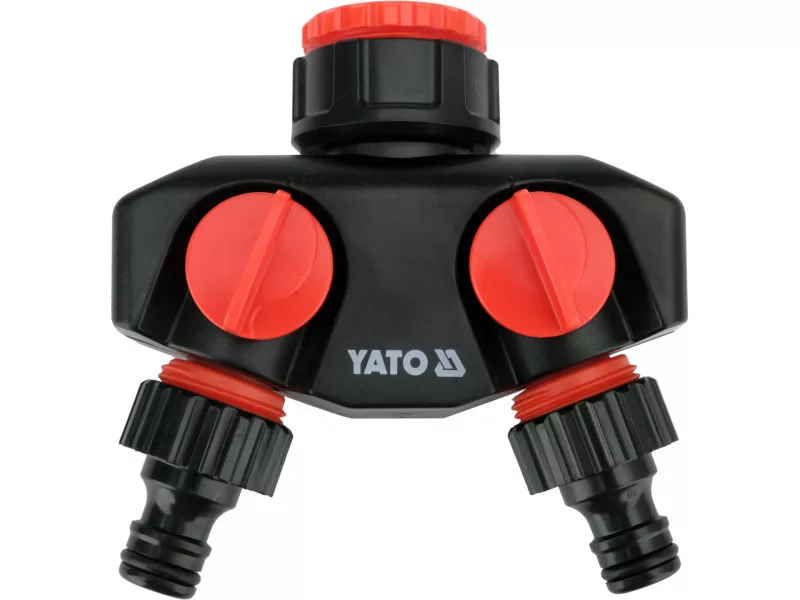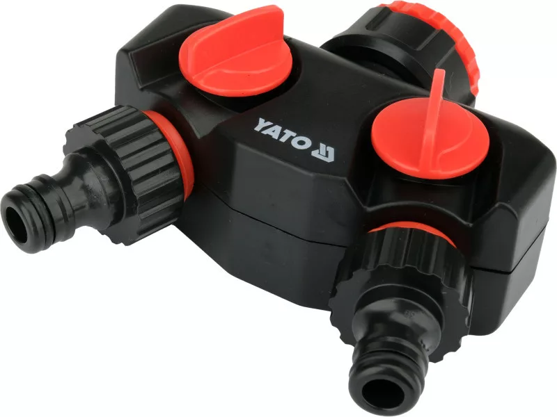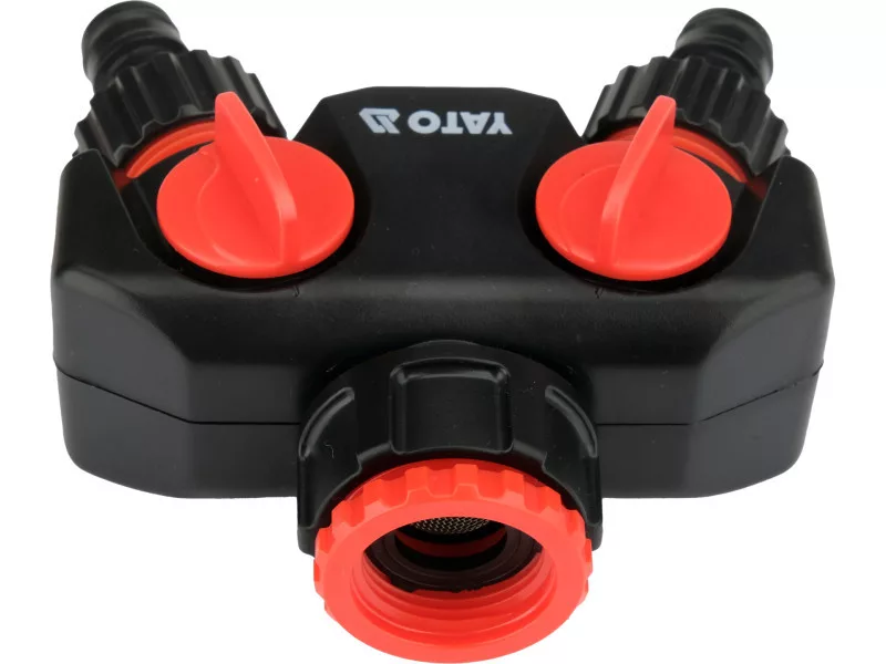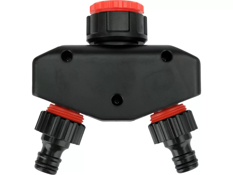 Solid splitter with a tap connection equipped with two outlets. Allows simultaneous connection of two independent water lines to one tap with a 3/4" or 1" thread. Made of durable ABS and POM materials, it ensures reliable operation and resistance to weather conditions and mechanical damage.
