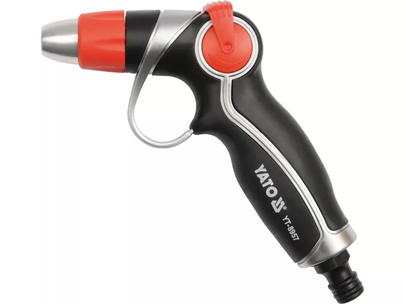 Sprinkling pistol with three types of stream: central, stream and mist. Made of aluminum and ABS. It has a stream intensity adjustment.