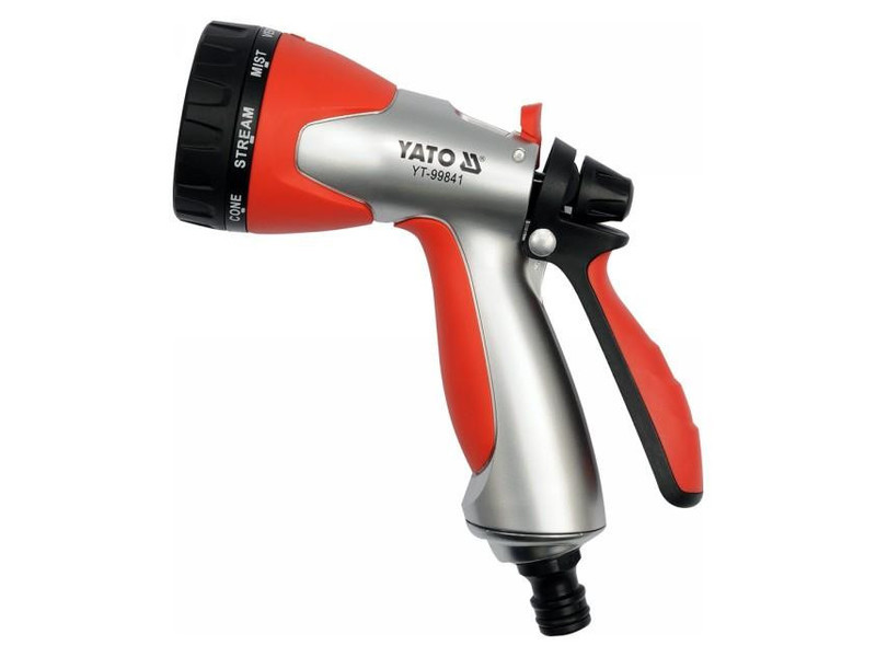 The sprinkler gun with 8 types of spray, has adjustable flow rate and a locking device for continuous operation.